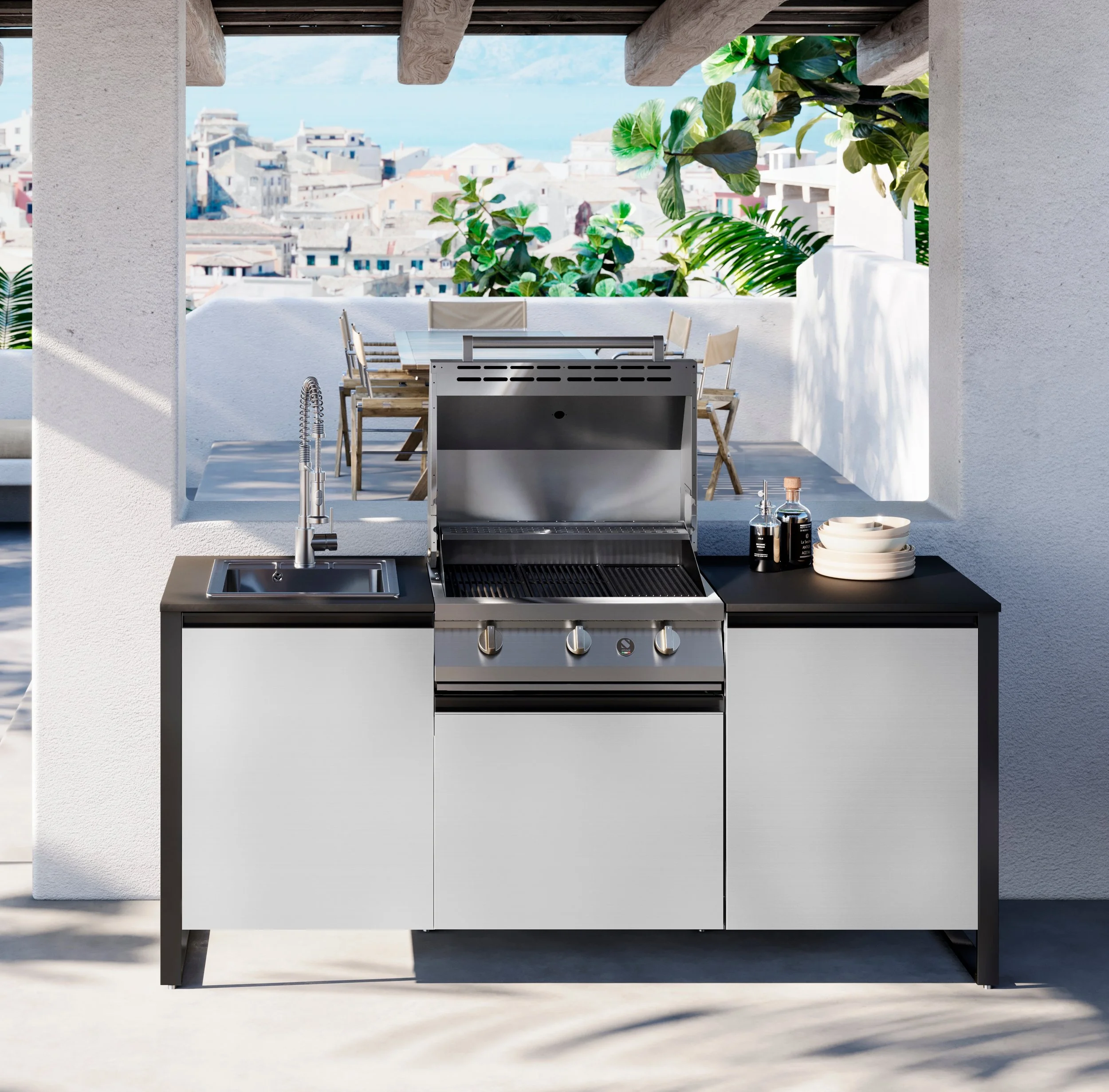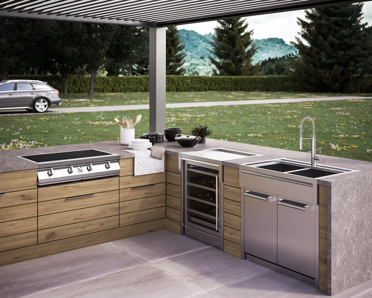 Swing outdoor kitchen combines balance, power and geometry.